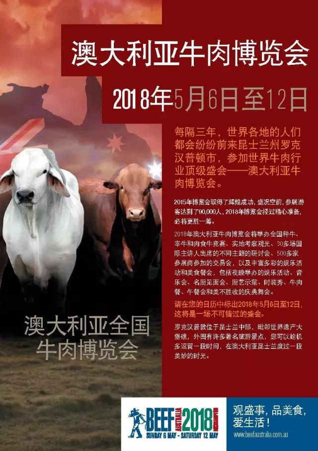 三年一次的澳大利亚牛肉博览会,将于2018年5月6日至12日,在牛肉之都昆士兰州的罗克汉普顿市牛气来袭!